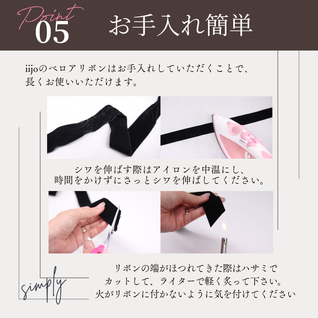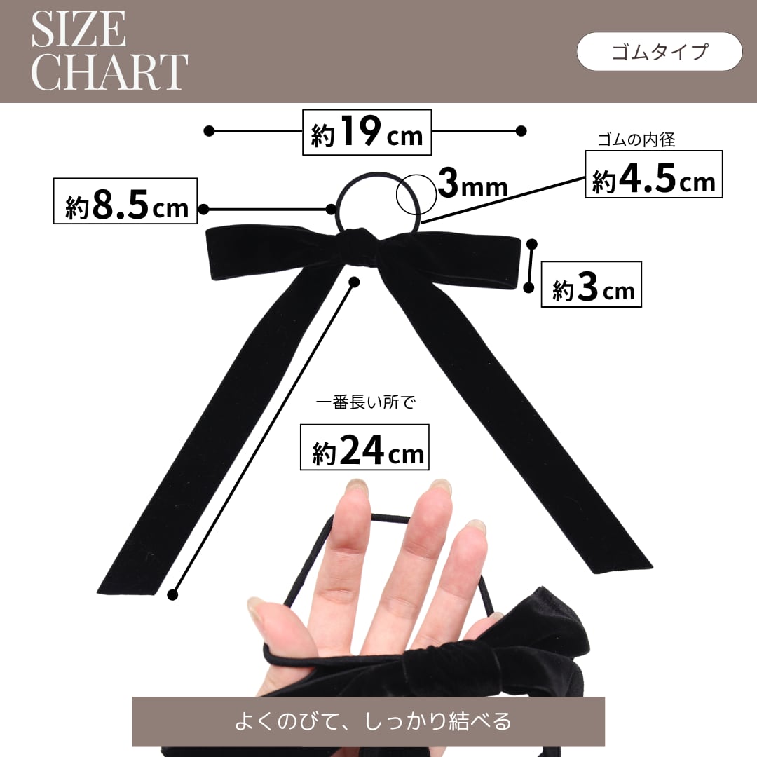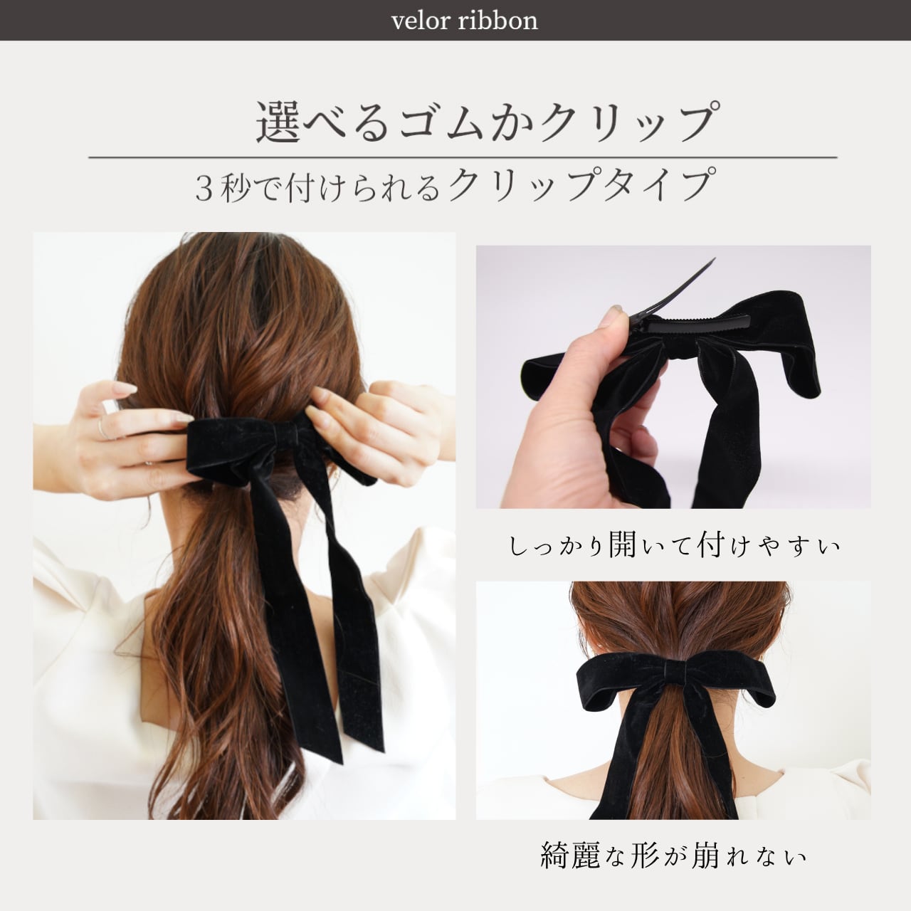 秋冬にぴったりの高級感あふれる「ベロアリボン」。ふんわりとした両面ベロア素材が、髪にやさしく馴染み、上品で可愛い印象を演出します。