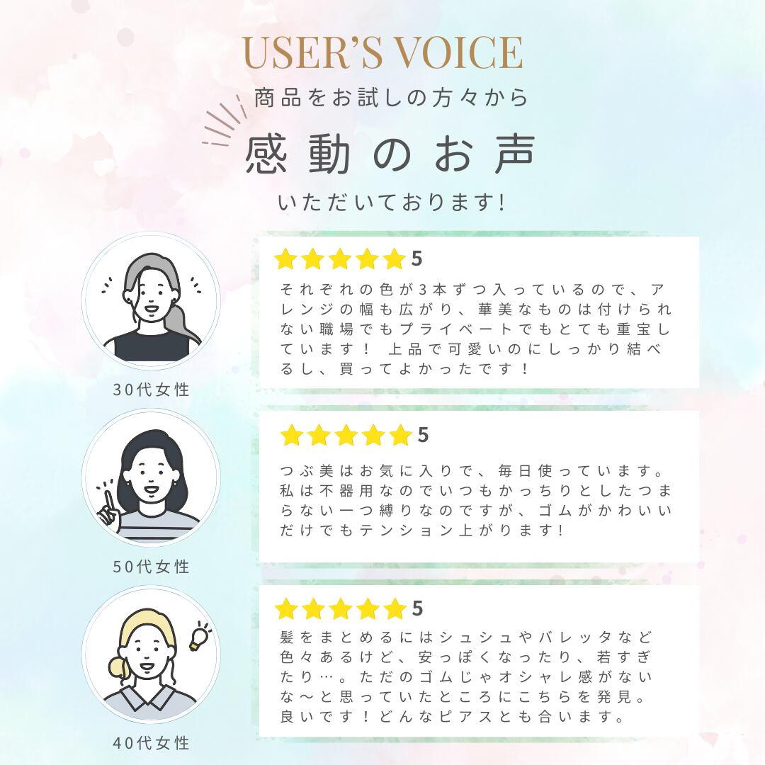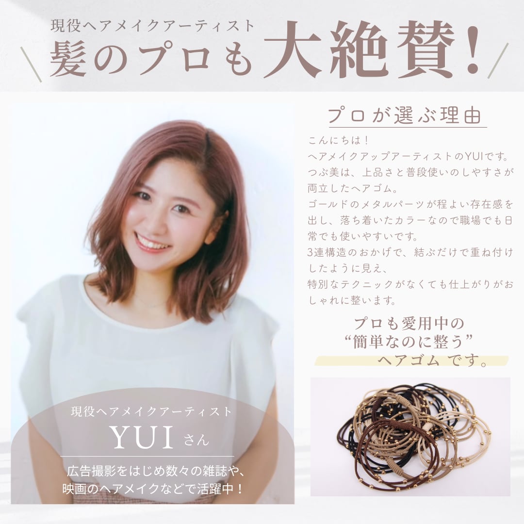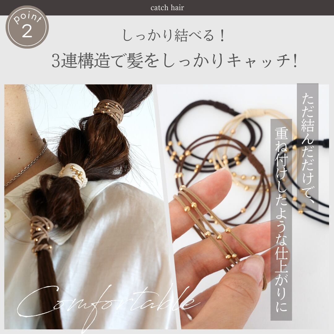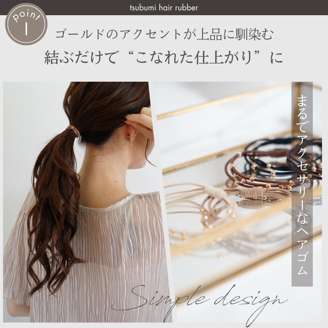 ポニーテールやハーフアップに使うだけで、簡単に華やかさアップ!しかも、ゴムがしっかりしているからヘアスタイルが長持ちするのもポイント◎