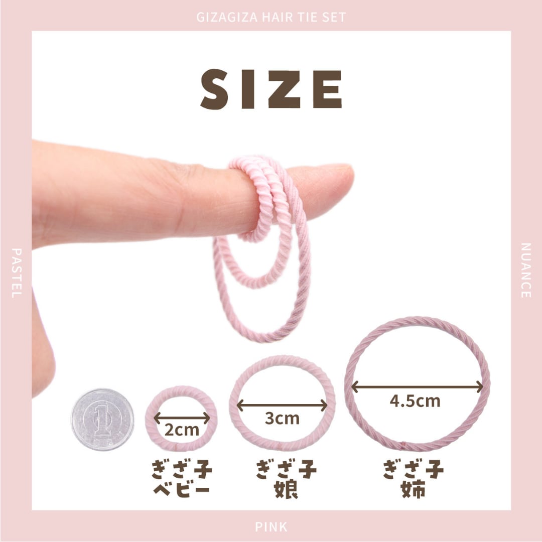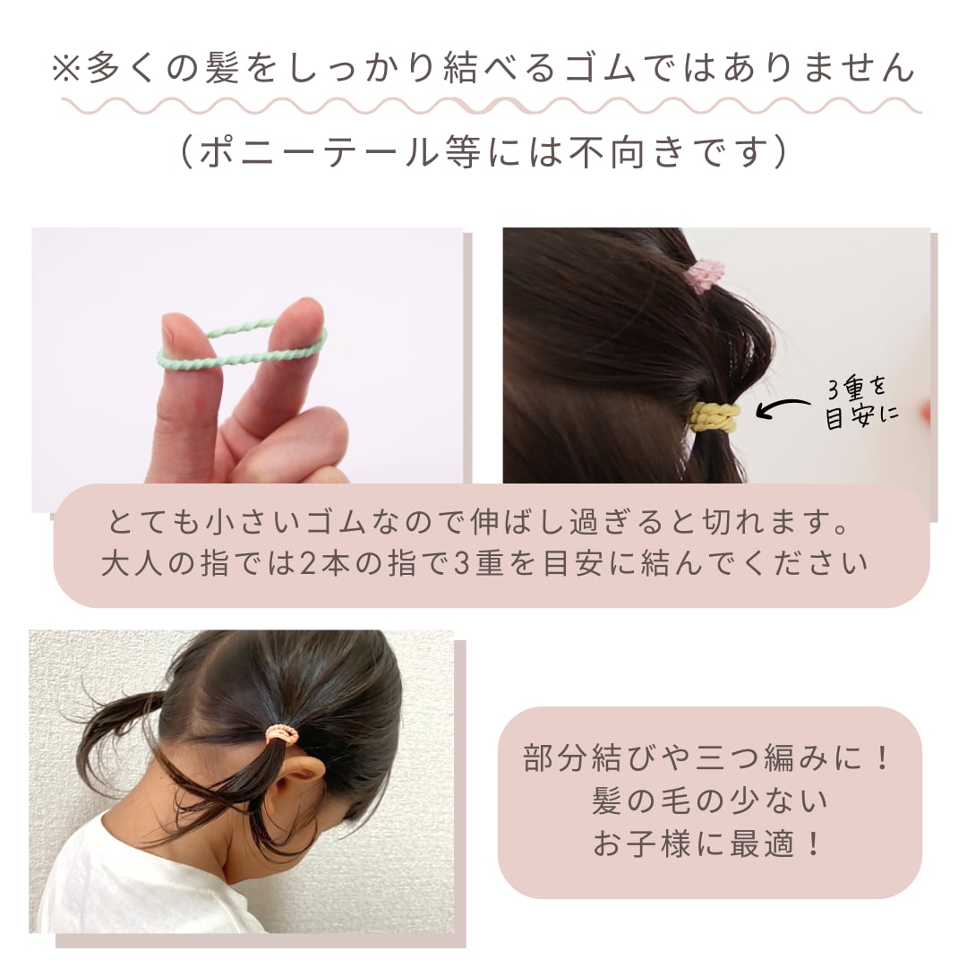 直径2cmの小さなゴムなのに、ぎざぎざデザインが細い髪もしっかりホールド。お昼寝しても跡がつきにくいから、赤ちゃんのヘアアレンジにも◎。